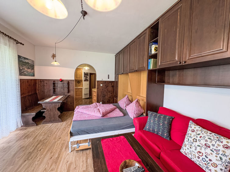 "Dachstein Top 2", 2-Zimmer-Wohnung 42 m2, im Erdgeschoss. Objekt geeignet für 2 Erwachsene + 2 Kinder. Einfach und gemütlich eingerichtet: Wohn-/Schlafzimmer mit 2 Wandklappbetten (90 cm, Länge 200 cm), Essecke und Kabel-TV (Flachbildschirm), Radio. Ausgang zur Loggia. Kabine mit 1 x 2 Etagenbetten. Offene Küche im Eingang (4 Kochplatten, Backofen). Bad/WC. Balkon, Südlage und Ostlage. Balkonmöbel. Seitliche Sicht auf die Landschaft. Zur Verfügung: Internet (WLAN, gratis). Bitte beachten: Rauchmelder. Anstelle eines abgeschlossenen Schlafzimmers befinden sich manche Schlafplätze in einem offenen Bereich (Galerie, Nische etc.). 50408-000602-2021