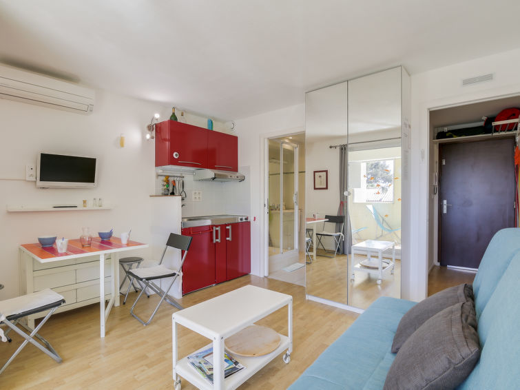 Studio 20 m2 au 1er étage. Aménagement confortable et agréable: entrée, sans fenêtre avec 1 divan-lit double (130 cm, longueur 180 cm). Séjour/salle à manger avec 1 divan-lit (140 cm, longueur 190 cm), TV et air-conditionné. Sortie sur la terrasse. Coin cuisine (mini-four, 2 plaques vitrocéramiques, grille-pain, bouilloire électrique, micro-ondes, cafetière électrique). Douche/WC. Chauffage à air chaud. Terrasse 6 m2, couverte, situation sud. Meubles de terrasse. Vue sur le jardin. A disposition: lave-linge, fer à repasser. Internet (Connexion WIFI, en sus). Place de parking. Veuillez noter: TV seulement FR. Détecteur de fumée. 83009 000012 DK