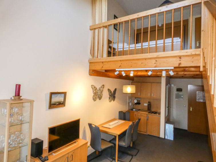 Appartement 1-kamer 45 m2 op 2 verdiepingen op de 1e verdieping. Gezellig ingericht: woon-/eetkamer 25 m2 met Sat-TV (Flatscreen TV), CD-speler, stereo-installatie en DVD. Uitgang naar het balkon. Kookhoek (2-pits kookplaat, broodrooster, waterkoker, magnetron, elektrische koffiemachine). Douche/WC. Zolderverdieping: open galerij 10 m2 met 1 2-pers bed (180 cm, lengte 200 cm). Klein balkon 8 m2. Balkonmeubilair. Mooi uitzicht op het meer en de bergen. Ter beschikking: Internet (Internet (WiFi), gratis). Niet rokers woning. Maximaal 1 huisdier/hond toegestaan. Rookmelders. In plaats van een afgesloten slaapkamer bevinden sommige slaapgedeeltes zich in een open ruimte (galerij, nis, etc.).